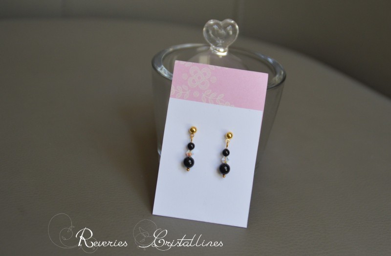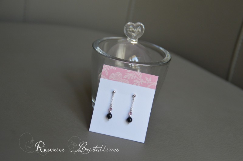 4 - Boucles "Idylle" - clous et chaînettes en argent 925, cristaux de Swarovski roses, perles Preciosa couleur "noir mystic".