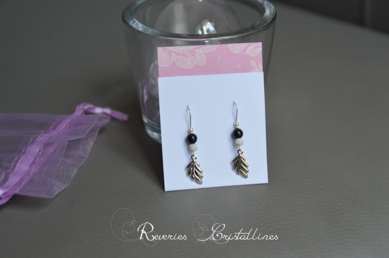 3 - Boucles "Emilia" - accroches en fil de cuivre plaqué argent, perles Preciosa "noir mystic", billes en argent 925 diamantées, breloques feuilles en argent 925.