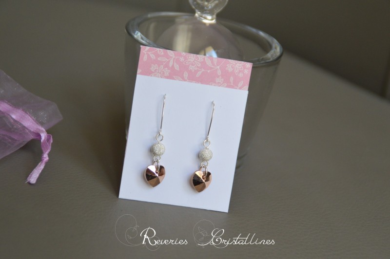 2 - Boucles "Myriana" - coeurs en cristal de Swarovski "rose gold", billes en argent 925 diamantées, accroches en fil de cuivre plaqué argent.
