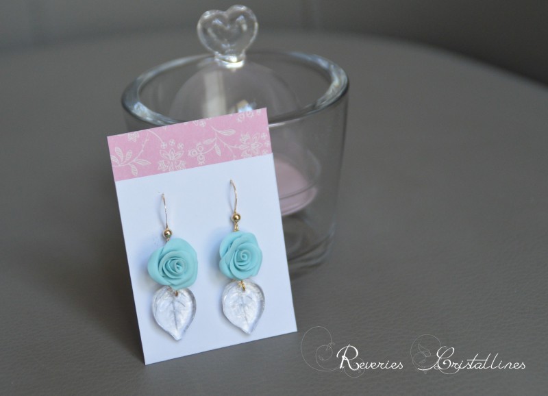 7 - Boucles "Rosanna bleues" - accroches en or gold filled 14 carats, roses en porcelaine froide façonnées à la main de couleur bleu azur, feuilles en verre.
