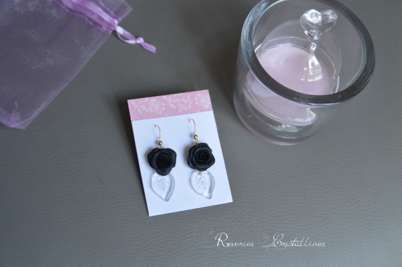 8 - Boucles "Rosanna noires" - accroches en or gold filled 14 carats, roses en porcelaine froide façonnées à la main de couleur noir, feuilles en verre.