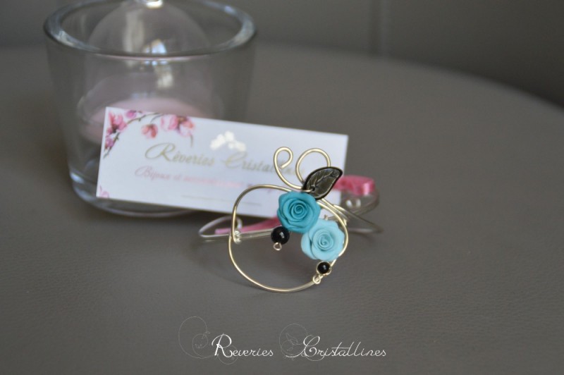 27 - Bracelet "Bleuet" - sur fil de cuivre plaqué argent, roses en porcelaine froide façonnées à la main (couleurs turquoise nacré et bleu azur), feuille en verre noire, perles Preciosa "noir mystic".