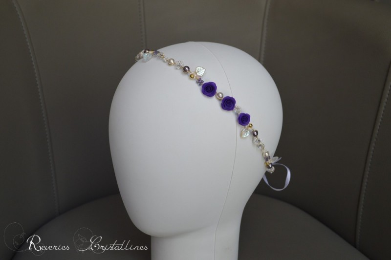 17 - Headband "Bohème" - tissé sur fil de cuivre plaqué or, filles en or gold filled 14 carats, roses en porcelaine froide façonnées à la main (teinte violette), perles Preciosa blanches et parmes, feuilles en verre, cristaux de Swarovski et mini rocailles. Ruban de satin blanc pour l'ajuster à votre tour de tête.