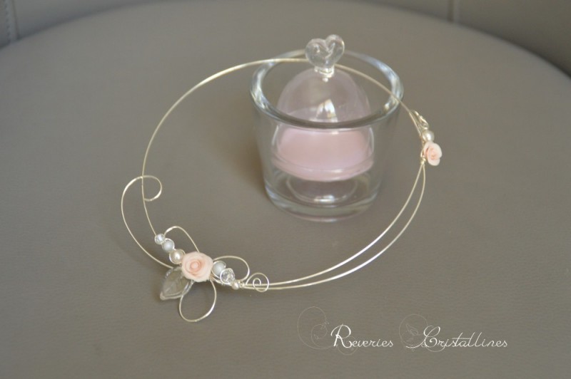 12 - Collier "Aloès" - sur fil de cuivre plaqué argent, roses en porcelaine froide façonnées à la main (couleur rose carné), perles Preciosa gris pastel et blanc, cristaux de Swarovski et feuille en verre. Fermeture du côté gauche.