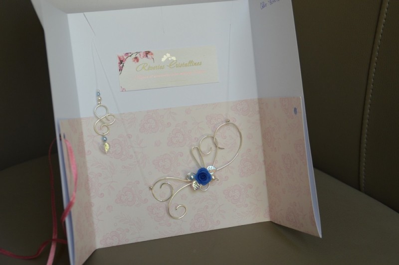 13 - Collier "Bohème bleu" avec bijou de dos - sur fil de cuivre plaqué argent, rose en porcelaine froide façonnée à la main (couleur bleu roi), feuilles en verre, perles Preciosa blanches et bleu nacré. Fermoir mousqueton en argent 925.