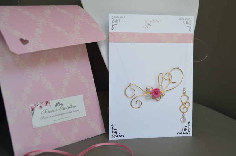15 - Collier "Bohème rose" avec bijou de dos - sur fil de cuivre plaqué or, rose en porcelaine froide façonnée à la main (couleur rose nacré), feuilles en verre, perles Preciosa blanches et rose pastel. Fermoir mousqueton en or gold filled 14 carats.