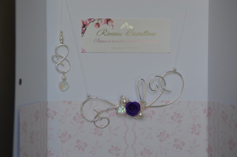 14 - Collier "Bohème violet" avec bijou de dos - sur fil de cuivre plaqué argent, rose en porcelaine froide façonnée à la main (couleur violette), feuilles en verre, perles Preciosa blanches. Fermoir mousqueton en argent 925.