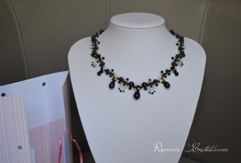 11 - Collier "Délicieuse" - tissé de perles Preciosa "noir mystic", strass, mini rocailles et cristaux de Swarovski. Fermoir mousqueton en argent 925 avec chaînette de réglage.