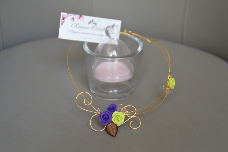 16 - Collier "Edelweiss" - sur fil de cuivre plaqué or, roses en porcelaine froide façonnées à la main (couleur violette et vert anis), feuilles en verre mordorée, perles en verre de Bohème "parme".
