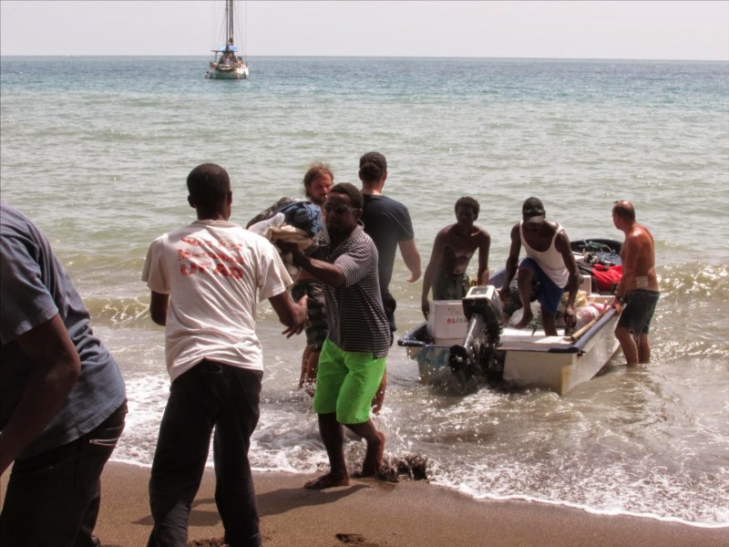 Le voilier, au mouillage dans l'anse de Petit Goave (Haïti), a été déchargé à l'aide d'une embarcation à moteur. Les cartons ELISA (1m3 de fournitures scolaires et de vêtements) sont bien arrivés à "bon port", avant d'être distribués aux enfants des écoles !