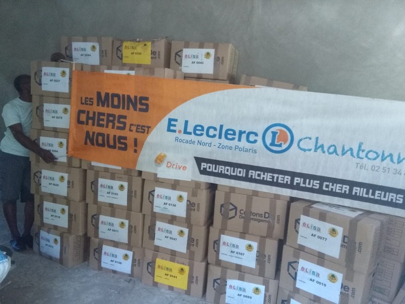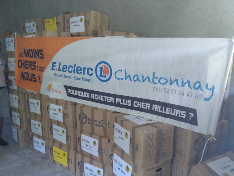 La banderole Leclerc Chantonnay est ainsi fièrement déployée devant une pile de cartons, à leur arrivée à Marbial (une partie de ces cartons contiennent des dons collectés par Leclerc Chantonnay) ...