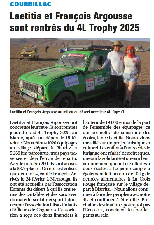 "Charente Libre" de ce matin consacre un article, avec photo, sur la 4L n° 260 de Laetitia et François qui vient de terminer brillamment le Raid 4L Trophy ..