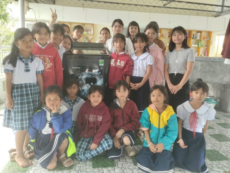 Les jeunes filles de Hué / Phu Loc se sont retrouvées autour de la nouvelle machine pour remercier ELISA Enfants d'Ailleurs de les avoir "dépannées" !